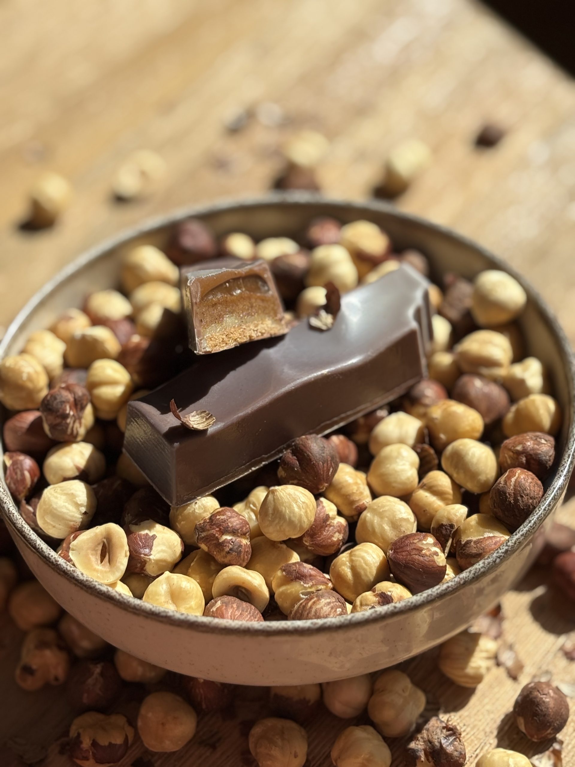 Sous une fine couche de chocolat au lait, se dévoile une pâte sucrée croquante, surmontée d’une ganache vanille fondante et de praliné noisette au parfum intense. Le tout est lié par un caramel à la vanille, souple et légèrement salé grâce à une touche de fleur de sel. Une barre riche et équilibrée, où le croustillant rencontre le fondant, et la douceur s’éclaire d’un éclat salin.