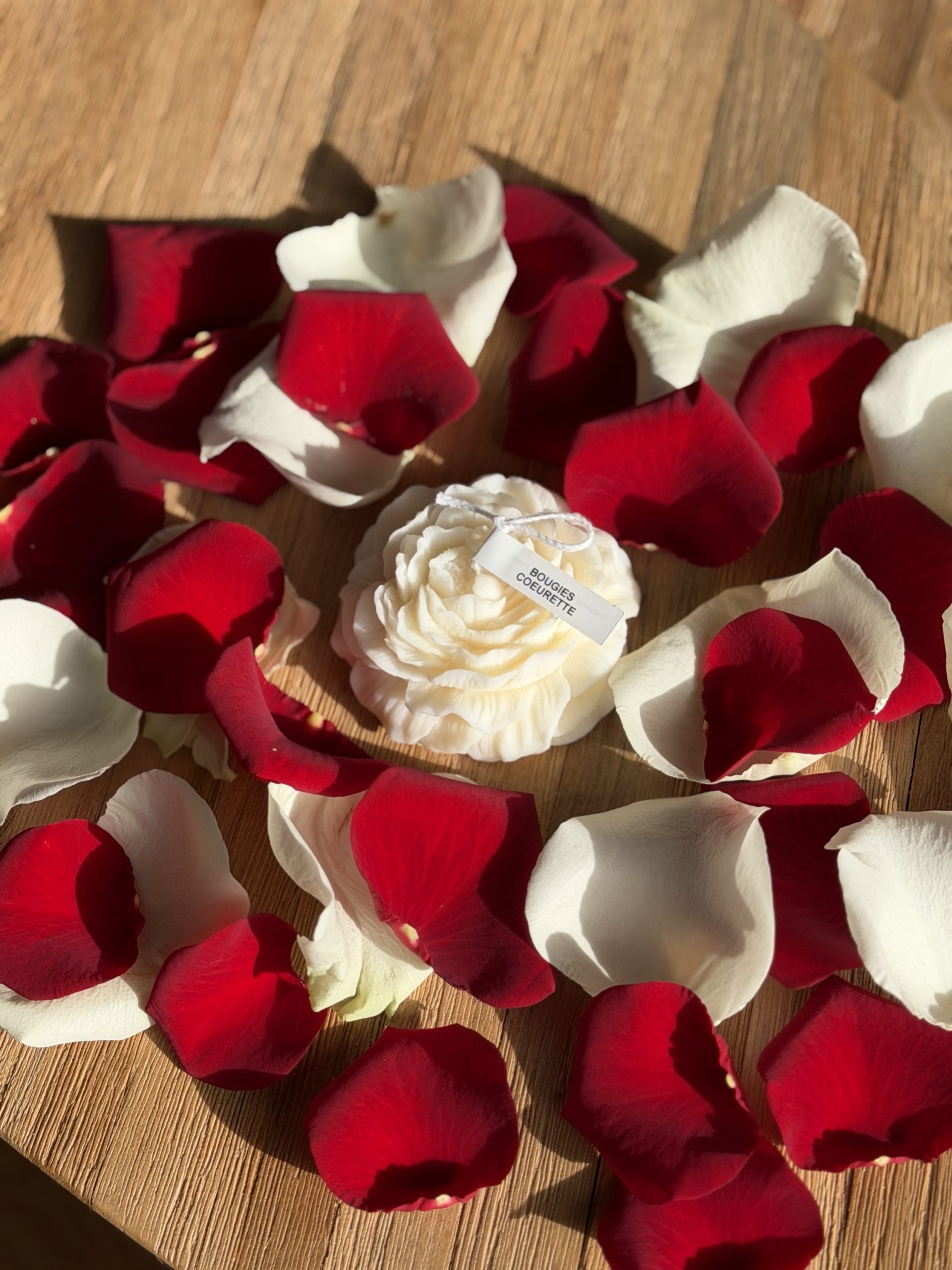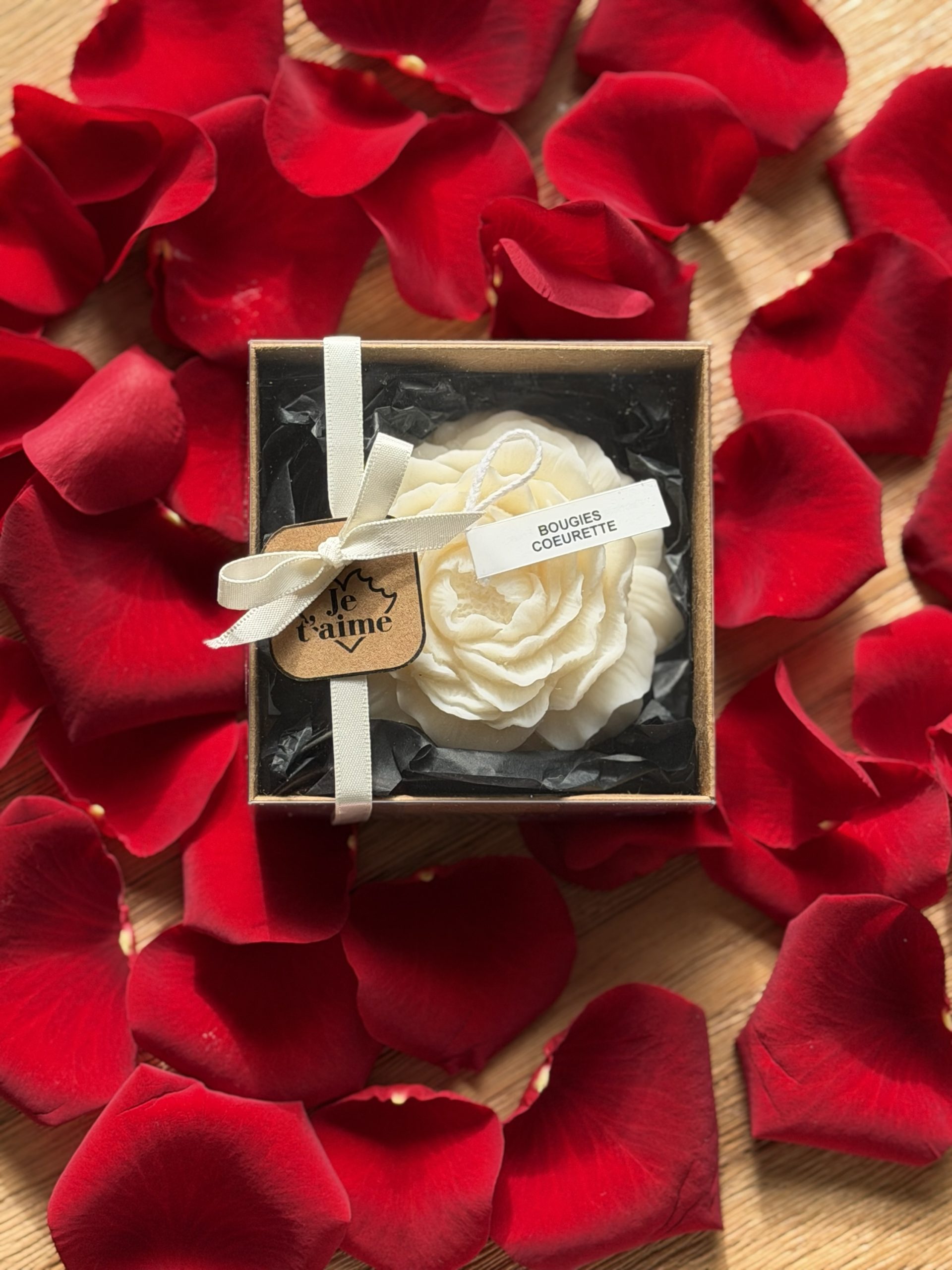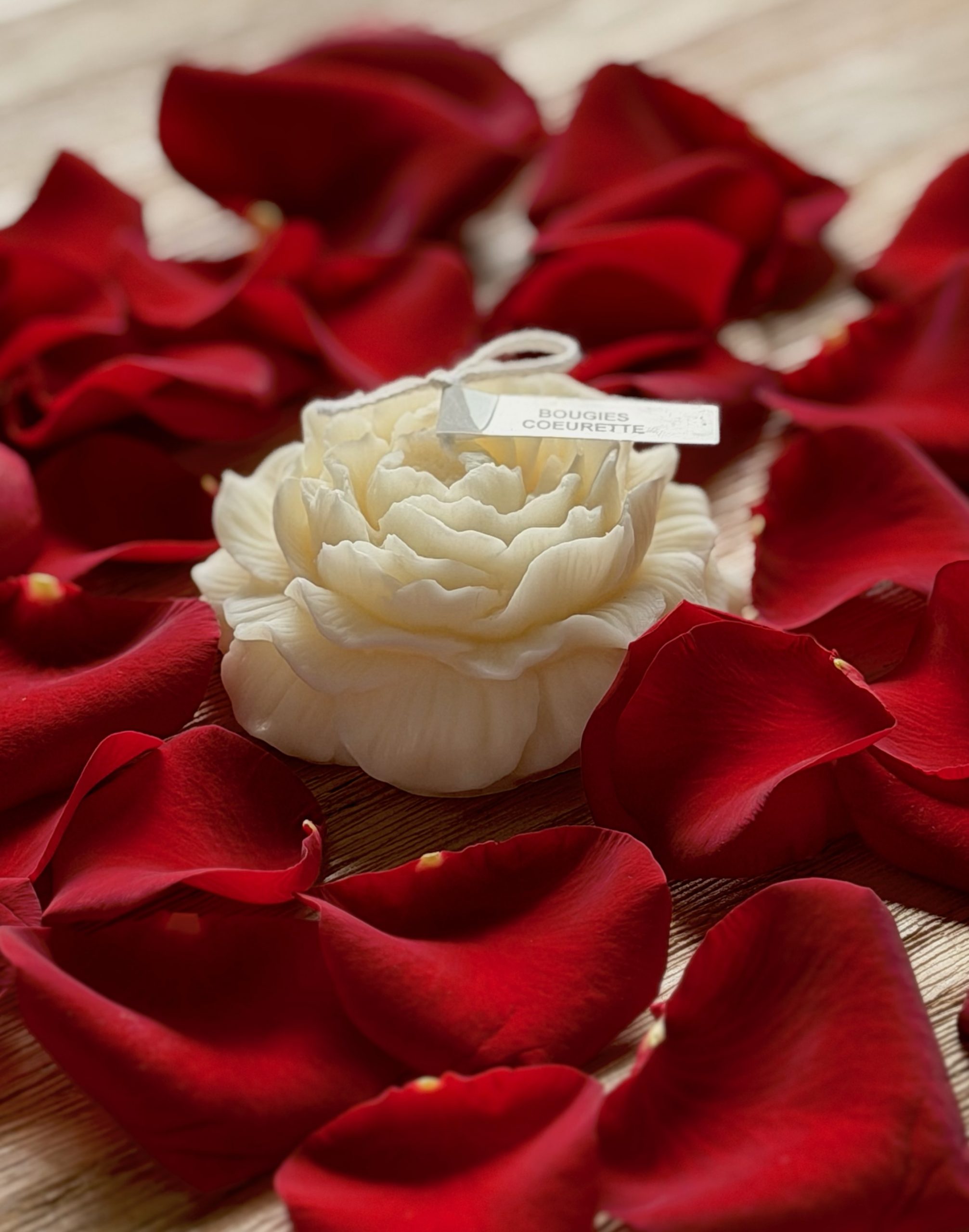 Voici une bougie en forme de pivoine soigneusement fabriquée par Bougies Coeurette. Une bougie élégante, senteur vanille et avec une petite inscription “Je t’aime” sur l’étiquette.