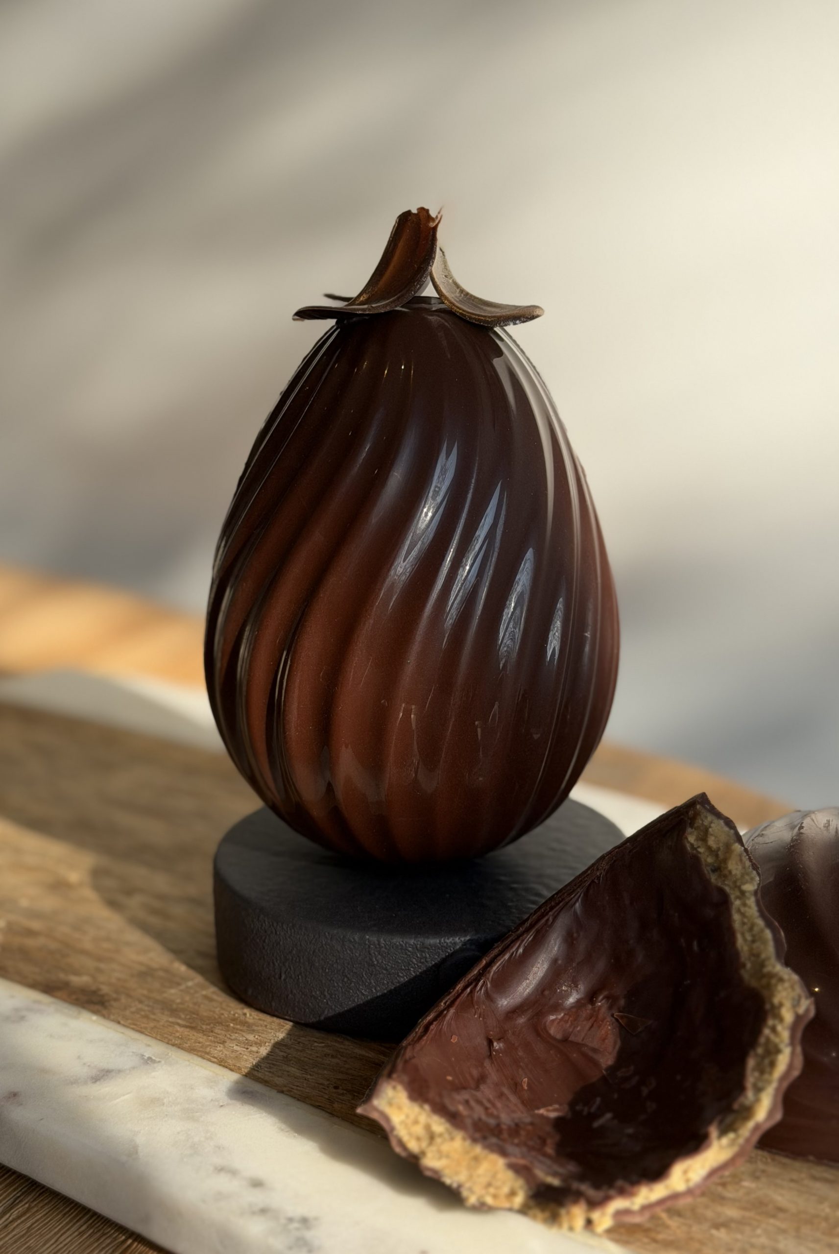 Il s’agit alors d’un oeuf au chocolat noir garni de praliné (l’un de nos praliné présent dans notre coffret de pâques).